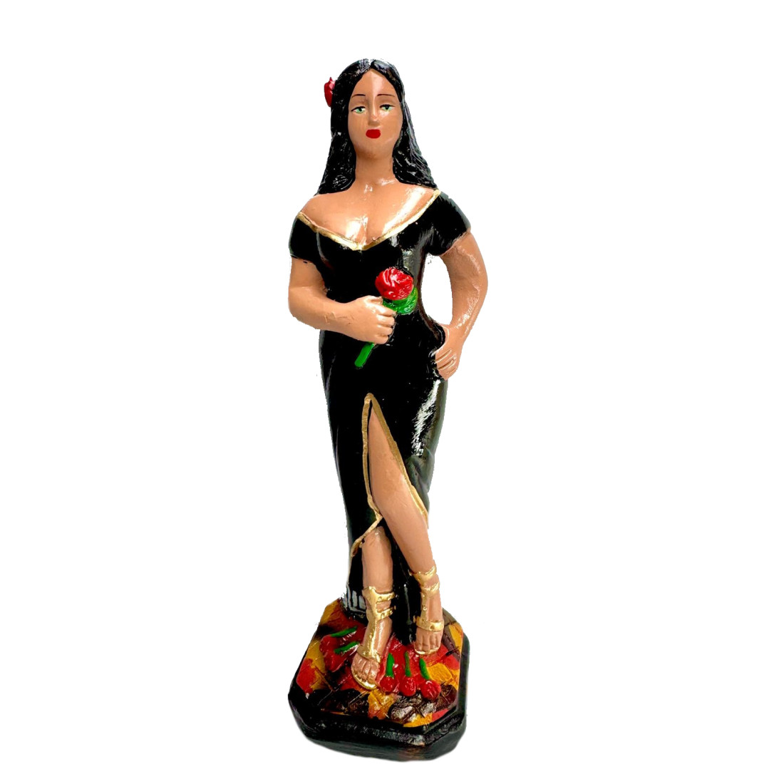 pomba gira dama da noite – 20cm Esta imagem brasileira da pomba gira dama da noite – 20cm faz parte da colecção de imagens afro-brasileiras da conceituada fábrica Imagens Bahia. Esta imagem da Pomba Gira Dama da Noite em gesso pertence a classe 20cm – W. As cores e as dimensões reais da pomba gira dama da noite – 20cm podem ser diferentes da perspectiva e da proporcionalidade apresentadas pelas definições do seu ecrã e pela nossa edição de fotografia. As dimensões atribuídas são aproximadas e não representam as medidas exactas da imagem, a medida apresentada representa a classificação ou o grupo de tamanho na qual se insere a imagem. Essa classe pode ter em consideração a altura mas também a largura e o comprimento da estátua (ex: a representação de uma imagem de joelhos não terá a mesma altura que a mesma imagem de pé mas será mais larga. Ambas poderão pertencer a mesma classe).