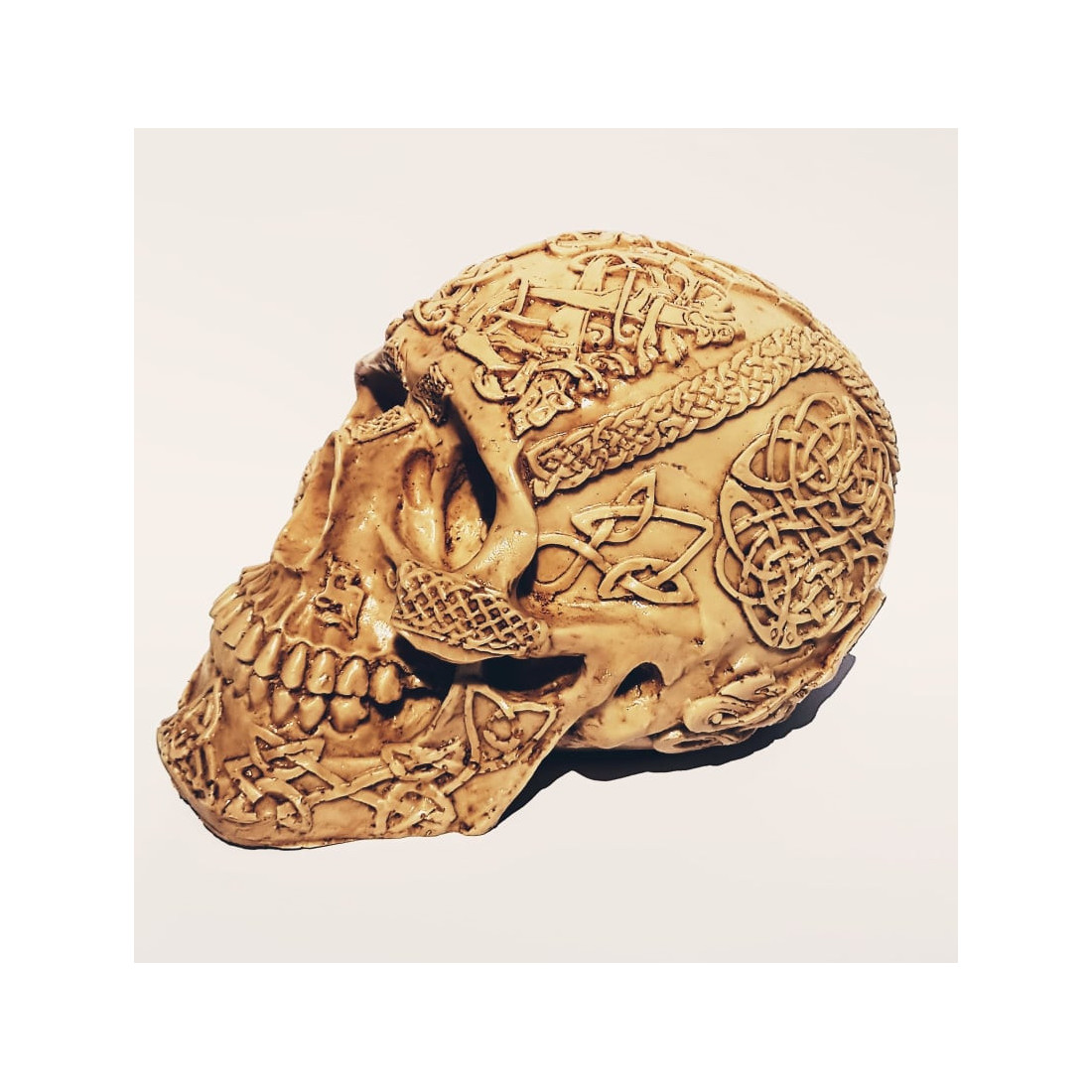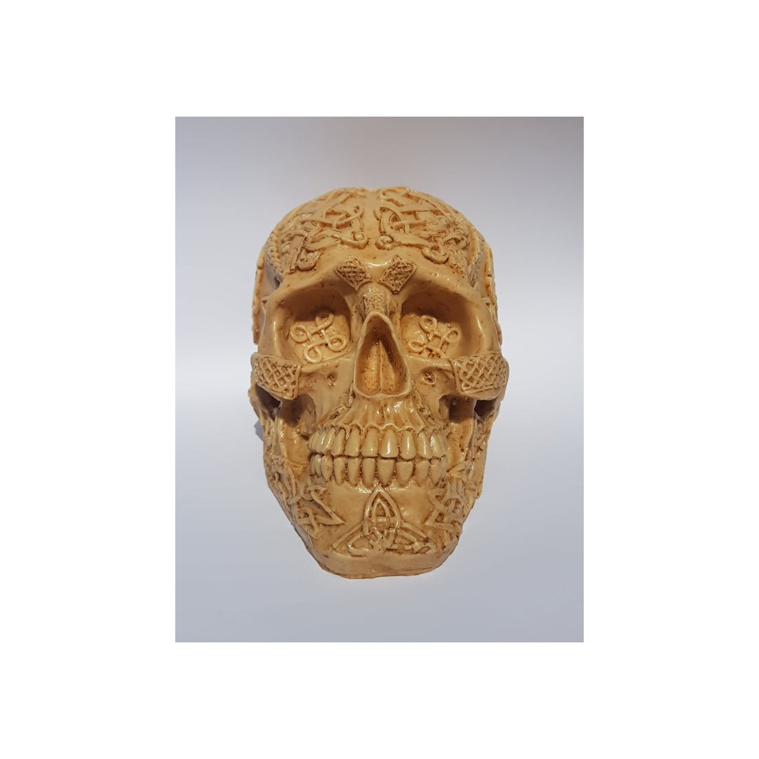 A imagem da caveira é feita em resina.
