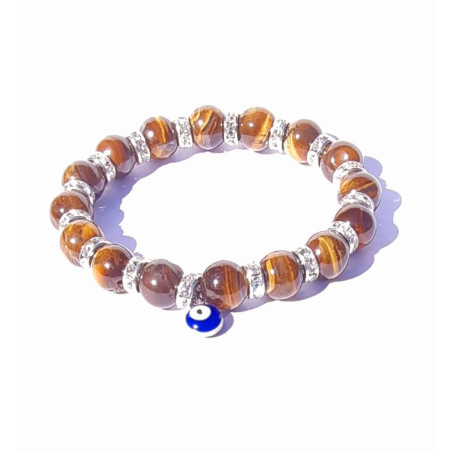 A Pulseira Olho de Tigre e Olho Turquia é composta por pedras lapidadas de olho de tigre, um protetor Olho da Turquia e argolas prateadas.
