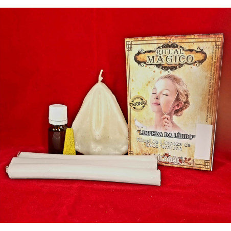 O ritual limpeza da líbido – mulher é composto por uma vela figura (vagina branca), um óleo ritualizado, uma barra de defumador, 3 velas brancas de 15 cm, uma oração e as instruções de utilização.