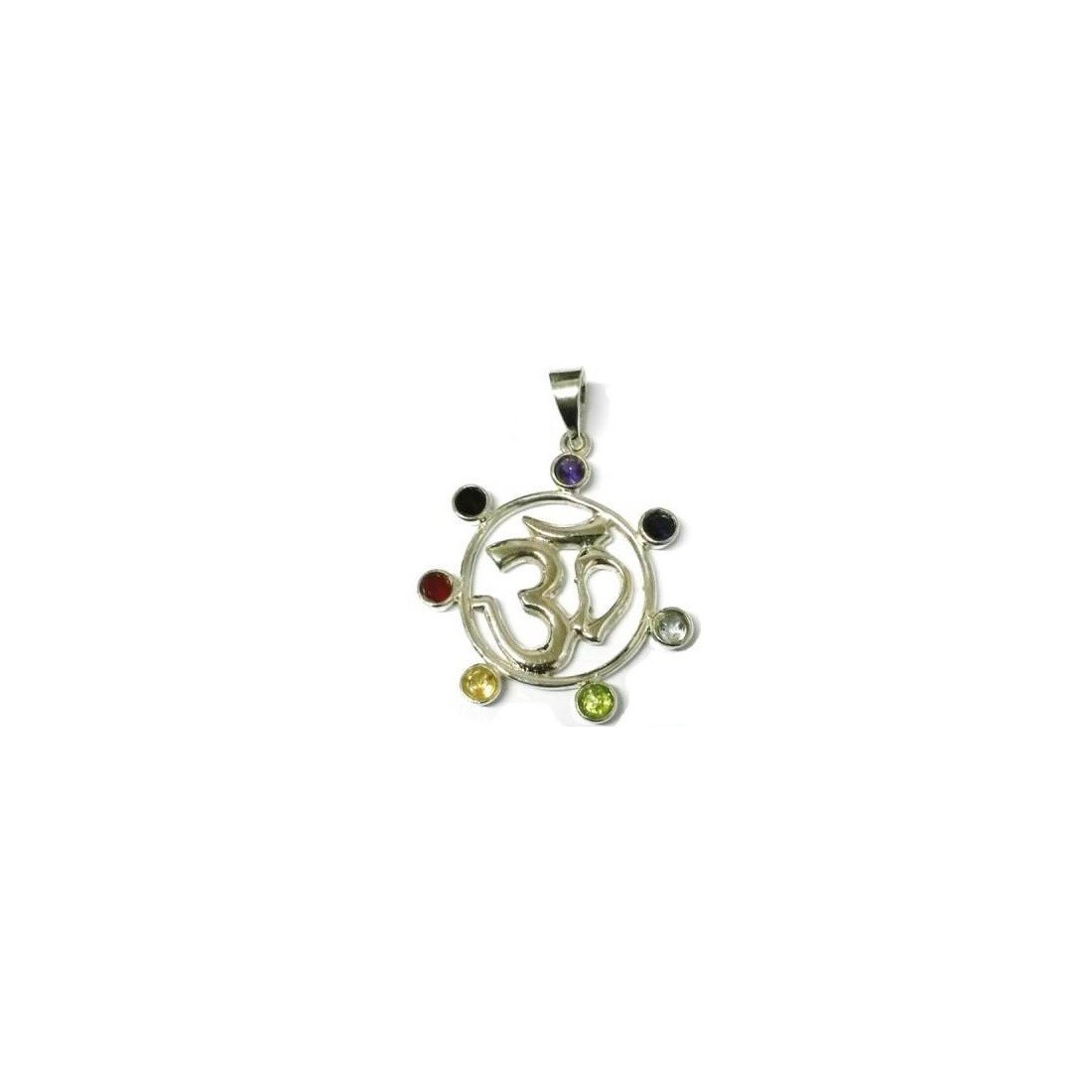 Este pingente om – chakras tem um diâmetro nas suas extremidades de aproximadamente 3cm. O diâmetro do aro interior é de 2cm. O circulo tem incrustado a sua volta as 7 pedras dos chakras.