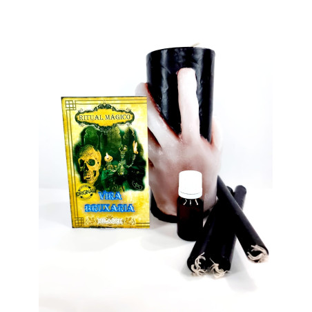 Cada conjunto do ritual vira bruxaria contém todos os ingredientes necessários para a execução do ritual. O ritual vira bruxaria é composto por um velão especial vira bruxaria, uma essência ritualizada “vira bruxaria”, 3 velas pretas, as orações específicas e as instruções de utilização. O corpo central desta vela tem 17 cm de altura por 7 cm de diâmetro com um peso aproximado de 650 gramas.