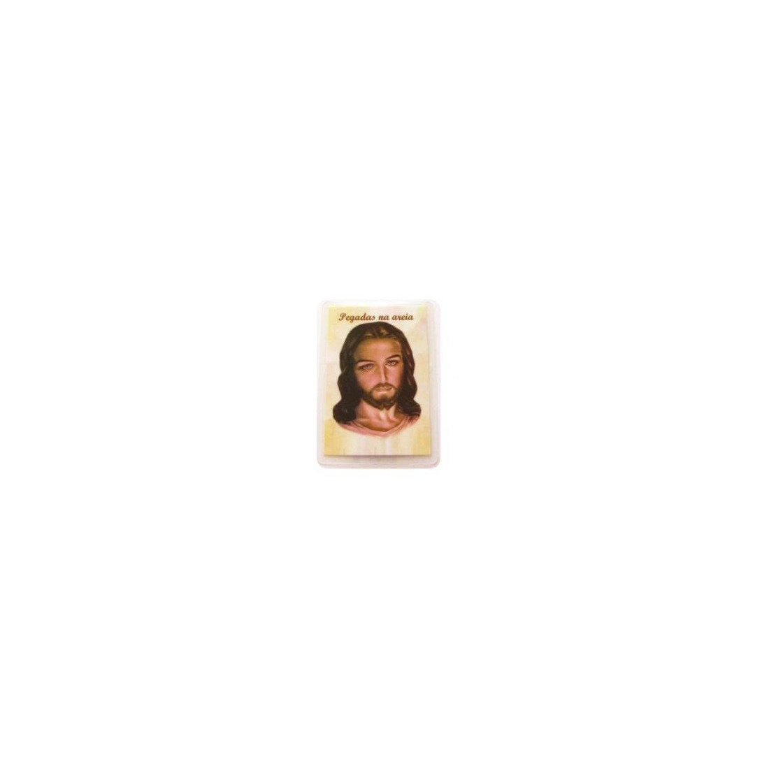 Esta pagela plastificada das Pegadas na areia faz parte da nossa colecção de cartões dos santos. Este cartão traz na frente a imagem de Cristo e no verso a oração das Pegadas na areia.