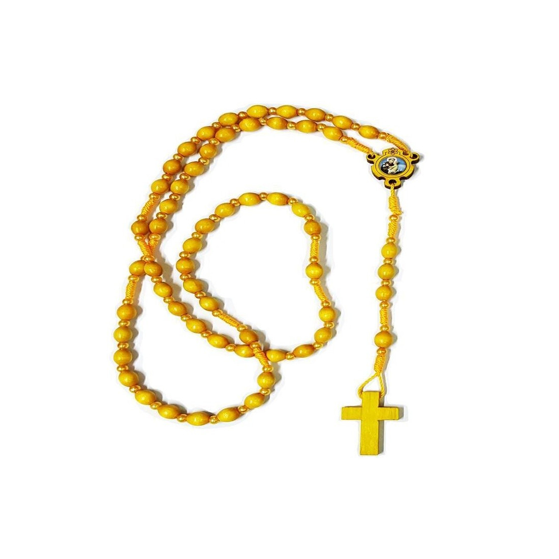 O terço de santo antonio – madeira amarela é um terço de contas de madeira de cor amarela. Este terço tem a particularidade de ter um passador com a imagem de Santo António.