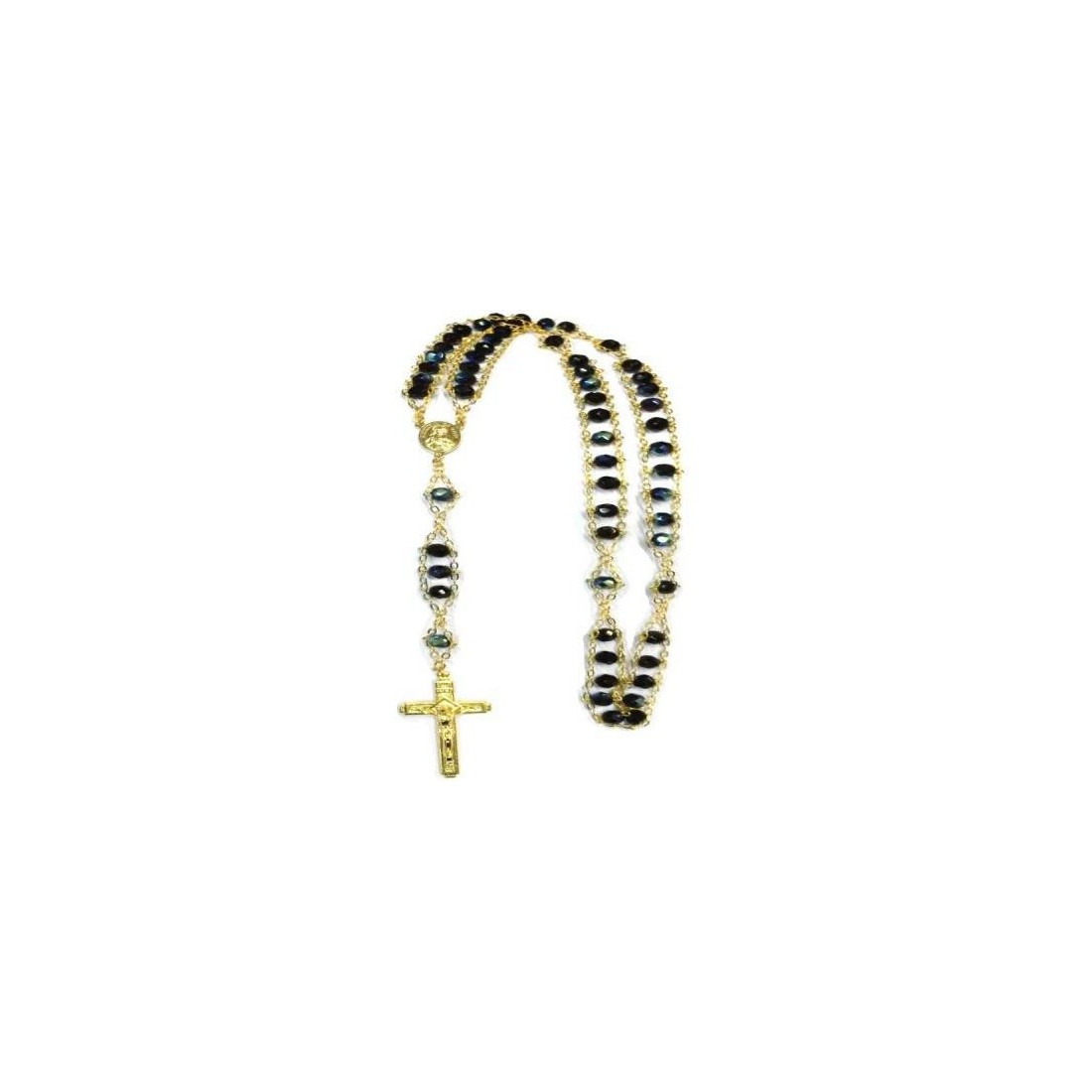 O terço vidro preto é um terço de contas de vidro preto brilhante, apresentando reflexos azulado à luz. O passador em metal durado do terço tem a imagem da face de Nossa Senhora de Fátima em relevo. O crucifixo do terço vidro preto é feito de metal dourado.