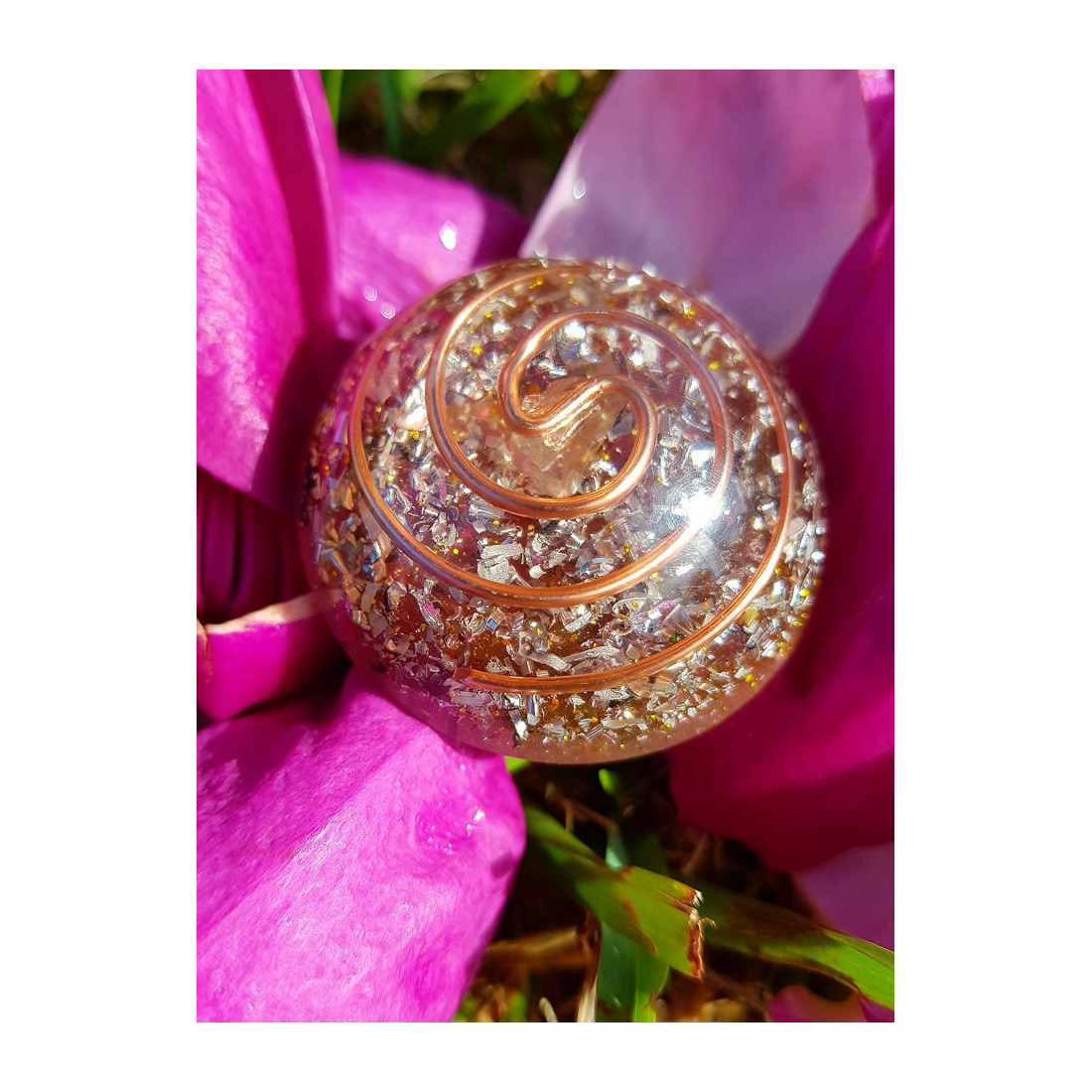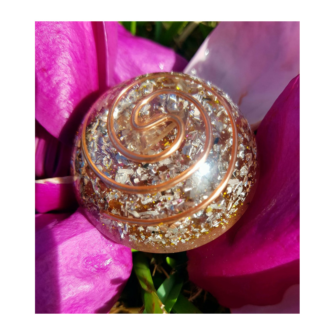 A resina tem propriedades e capacidades únicas para reter as energias acumuladas. Graças a compressão “metal-resina”, o quartzo activa a sua capacidade própria piezoeléctrica e gera electrões que transforma o electromagnetismo desordonado em ondas ordenadas, vitais e positivas.