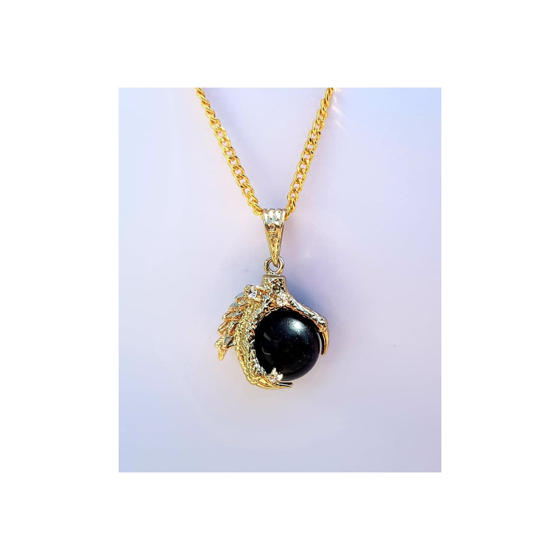Garra feita em Aço Inoxidável e com fio em metal dourado. (Bola -Ágata Negra)