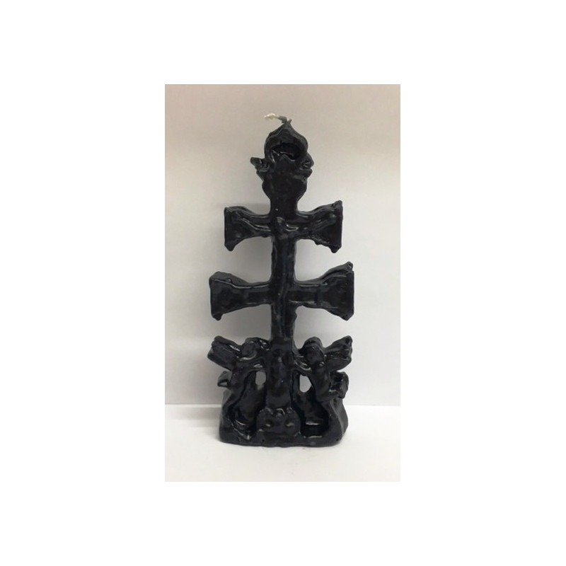 Esta vela foi moldada em forma de Cruz de Caravaca Preta para ser usada em rituais usando as mais finas parafinas e as melhores ceras.