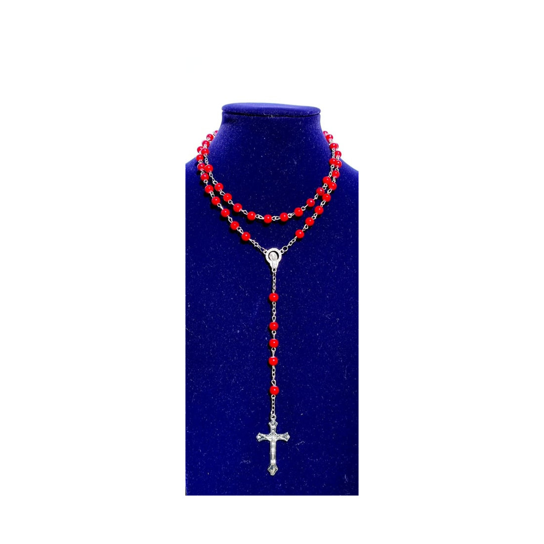 Este terço tem 50cm de comprimento de uma ponta do terço até a ponta do crucifixo. O passador tem incrustado a medalha de Nossa Senhora na frente.