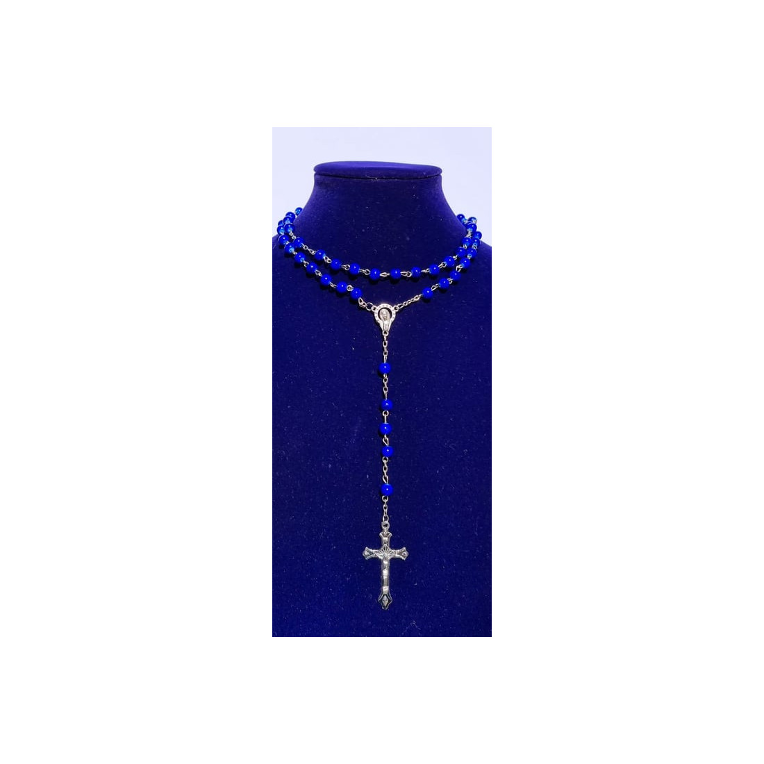 O terço ágata azul é um terço de contas com mineral de ágata azul. Este terço encerra-se com um crucifixo.