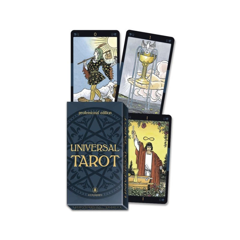 Este tarot universal – edição profissional é composto por um baralho de 78 cartas de grande qualidade, por uma elegante caixa rija para guardar o baralho e por um livrinho de instruções em inglês, castelhano, italiano, francês e alemão.