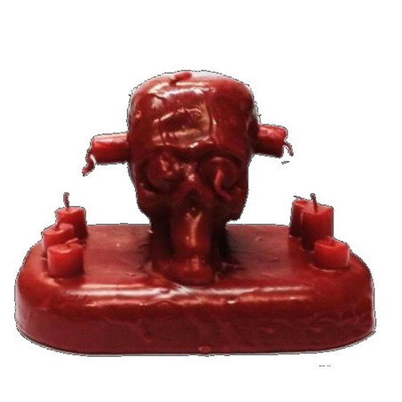 A vela do ritual 11 mechas caveira vermelha tem umas medidas aproximadas de 12.5 cm de altura por 11 cm de largura e 17.5 cm de comprimento.