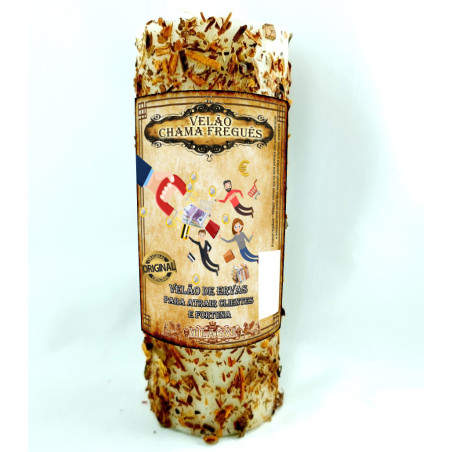 O velão de ervas chama freguês foi cuidadosa e artesanalmente preparado seguindo preceitos e formulas ancestrais afro-brasileiras, recorrendo à plantas, sementes e ervas especificas, às mais finas parafinas e ceras e aos mais naturais óleos essenciais. Este velão de ervas chama freguês é especialmente preparado para, seguindo um ritual especifico, atingir o fim pretendido.
